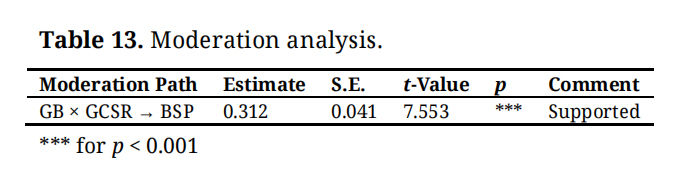 The moderating role of GCSR is supported by prior research. Gazi et al. [1] Bhatti et al. [29], and Yahya & Zargar [36] demonstrate that CSR initiatives focused on environmental and social sustainability enhance stakeholder trust and engagement. Luu et al. [39] further shows that CSR programs strengthen internal alignment and amplify the benefits of GB on SP. These studies support our proposition that GCSR moderates the relationship between GB and BSP.