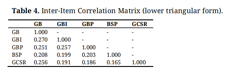 Inter-Item Correlation MatrixCorrelation Matrix in Table 4, the matrix of correlation can be found between the variables. GCSR has the strongest positive relationship with GB (r = 0.256), followed by GBI (r = 0.191) and BSP (r = 0.165). The correlation coefficients are all well below the critical levels, indicating no multicollinearity.