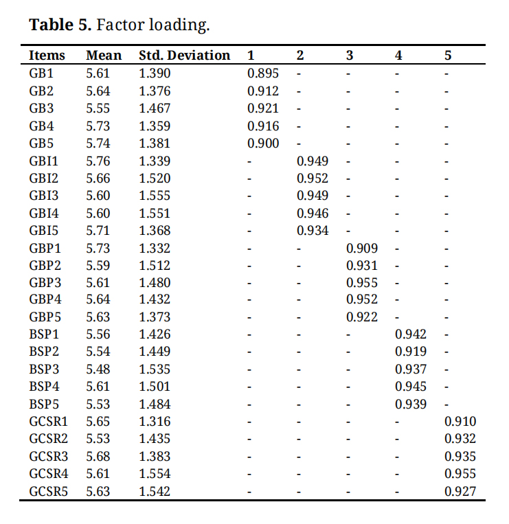 Table 8 presents the standardized regression weights and related statistics for various constructs involved in the study, such as GB, GBI, GCSR, GBP, and BSP. Each construct is measured through multiple items or indicators, with details provided on their factor loadings, standard errors, t-values, means, standard deviations, and internal consistency (Cronbach’s alpha). High factor loadings and t-values (generally above 1.96) indicate that the items reliably and significantly represent their respective constructs. For instance, the items related to GB show very high loadings and t-values, demonstrating they are strong indicators of that construct. The Cronbach’s alpha values are mostly above 0.9, reflecting excellent internal consistency and reliability of the measures. Overall, the table indicates that the measurement model is robust, with well-fitting items that reliably capture the underlying variables, ensuring confidence in the subsequent analysis of relationships among these constructs.