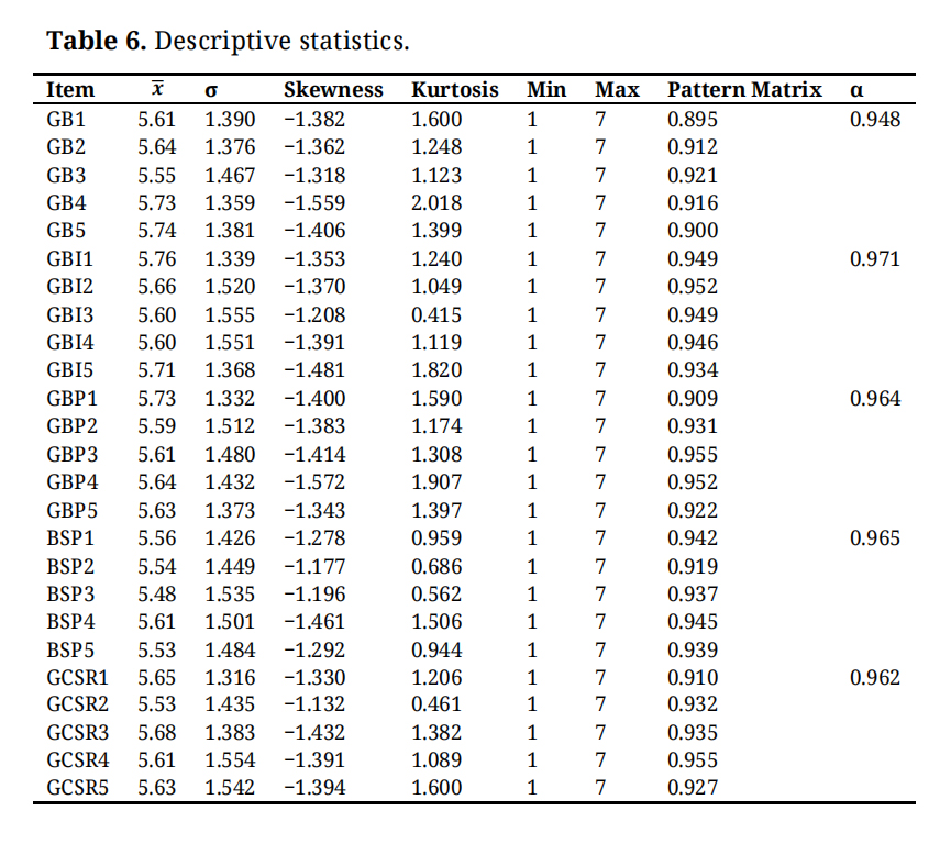 MeasuresAll measurement items for each construct were adapted from previously validated scales in the literature. The study examines employees’ perceptions of the relationships among GB, GBI, GBP, BSP, and GCSR. Each item was measured using a seven-point Likert scale ranging from 1 (“strongly disagree”) to 7 (“strongly agree”).