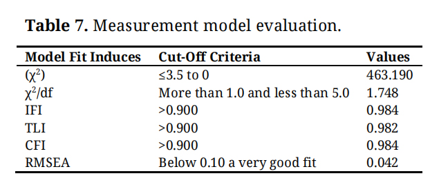 Descriptive StatisticsAfter removing duplications and incomplete questionnaires, we analyzed 420 responses. The mean values of the elements for the six used structures are presented in Table 6. The table shows the respective standard deviation of each construct with the range of their mean values. The following are found: 5.61 to 5.74, 5.76 to 5.71, 5.73 to 5.63, 5.56 to 5.53, 5.65 to 5.63. The computed means suggest that the mean opinions of the respondents were in line with the voice in questions of the survey. This shows that the great majority of participants have a positive attitude towards the tested factors. The evenness of the data was examined using skewness and kurtosis. Accuracy of data collection was reliable as demonstrated by values of skewness and kurtosis in the table, which were found within normal values. The data indicate the minimum and maximum response rates for each question asked. The Cronbach’s alpha levels of all items were higher than cut-off value for good internal consistency (0.7). Further, Table 6 shows that all item factor 104 loadings surpass the pre-determined value, and hence, a high internal consistency of the constructs is indicated.