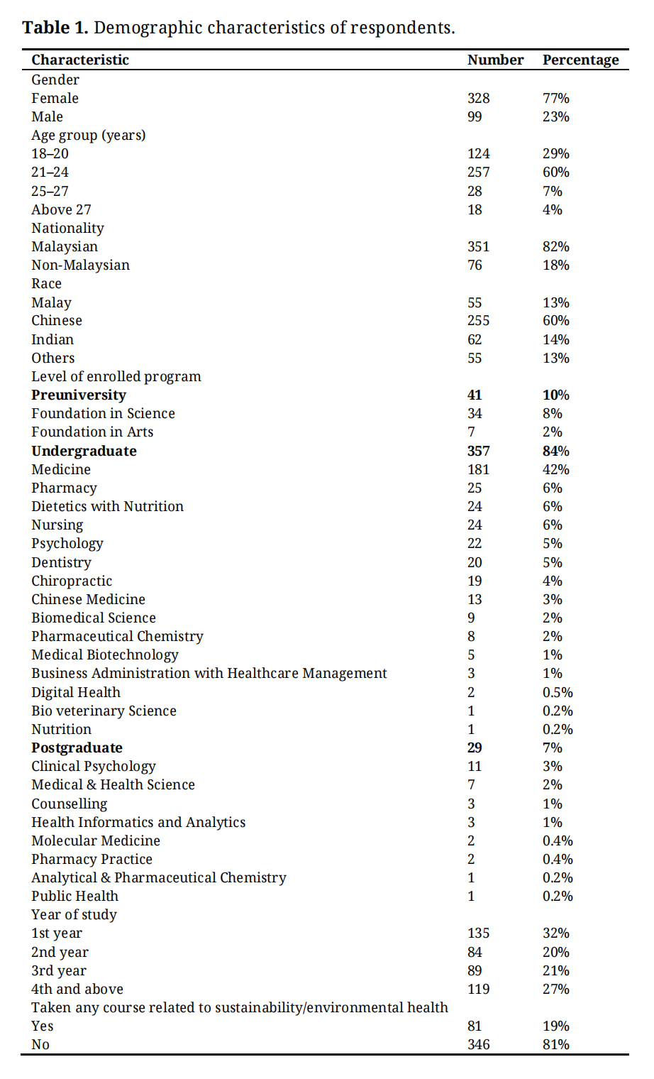 Strengths and limitations: A total of 427 students foundation, undergraduate, and postgraduate students were studied via a validated and pretested questionnaire. One of its limitations was that the survey was conducted mainly among health science students at one university. Participation was voluntary, which may have resulted in a higher participation of students who were more interested in sustainability issues. Moreover, the study may not have explored the participation and voluntary responses of students who did not engage in sustainability issues. The study was self-reported, and vouchers were provided as a token of appreciation. This may have influenced participation in the study. Thus, the sample may only be partially representative of the population of students in the courses included. The study was cross-sectional and causal implications cannot be examined. Finally, the students’ perceptions were collected using a questionnaire but were not triangulated with information from other methods and sources.
