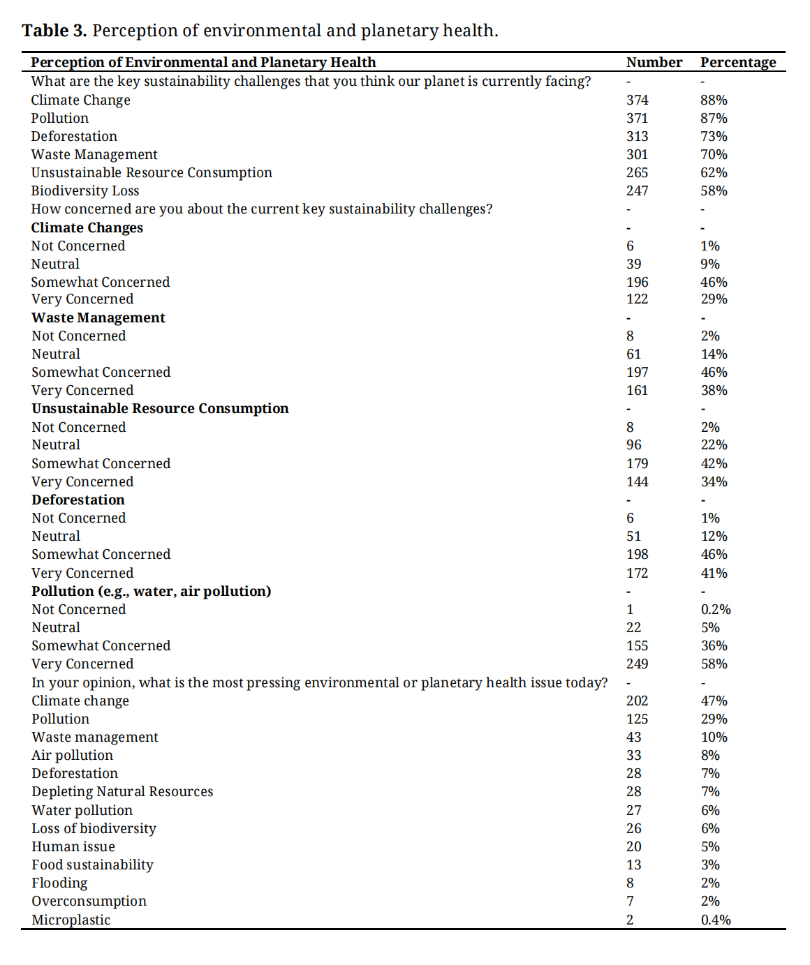 The respondents were familiar with different aspects of sustainability. Table 2 outlines responses to different questions. The respondents were most familiar with climate change, renewable energy, and waste management. A total of 395 respondents (92%) rated their current knowledge of environmental health as fair or good. For planetary health, 373 (88%) regarded their knowledge as fair or good. Table 3 illustrates the respondents’ perceptions of environmental and planetary health. They mentioned climate change, pollution, and deforestation as key challenges to sustainability. These three challenges mentioned by the respondents may be interconnected and changes in one can influence and affect others. Pollution has become a major issue in several nations Approximately 90% of the respondents were somewhat or very concerned about climate change, while 75% were concerned about challenges related to biodiversity loss.