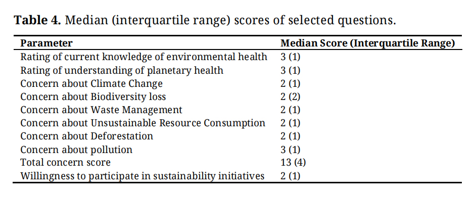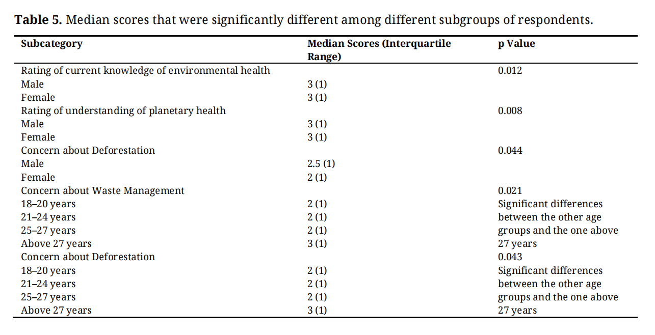 Table 4 indicates that median and knowledge scores were high, while concern scores were moderate except for pollution, which exhibited a high score. The total score for concerns regarding current sustainability challenges was calculated. The maximum possible score was 24 (median score: 13, interquartile range: 4). Table 5 demonstrates that there was a difference in the knowledge and understanding of the environment and planetary health among males and females though the median scores were the same. The mean scores were higher among males in both categories, and the non-parametric median test showed a significant difference. Scores for concerns regarding deforestation and waste management were higher for older respondents (those aged more than 27 years). The total score did not significantly differ among the subgroups of respondents.
