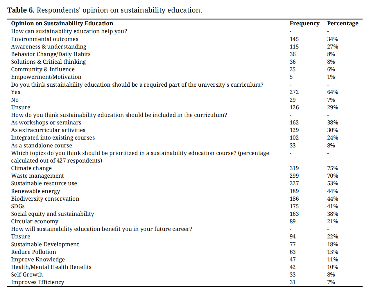 Conclusions: The findings can serve as a reference for the university’s efforts to integrate sustainability into its curriculum and promote sustainable practices among students. By identifying knowledge gaps and attitudes, this study can help in developing targeted educational strategies and institutional policies that other institutions may also consider. Similar studies in other universities are required.