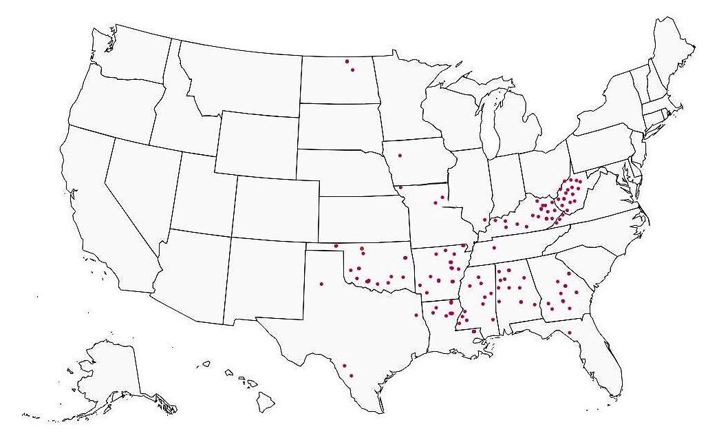 Of the 111 lowest-COL rural counties, 104 are located in the South, and the other seven are in the Midwest. One cluster is located in Appalachia, comprising West Virginia (n = 16) and Kentucky (n = 16), as well as a small portion of Appalachian Virginia. A second cluster parallels the Gulf Coast, including parts of Louisiana (n = 6), Mississippi (n = 11), Alabama (n = 11), and Georgia (n = 9). A third group is found in Oklahoma (n = 13) and Arkansas (n = 12) (see Figure 1). Readers interested in replicating the Niche data should sign into Niche and query “2025 counties with the lowest cost of living.” Martin County (KY) will be the first listed.