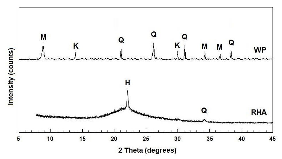 Figure 1. XRD patterns of WP and RHA. Identified crystalline phases: M—mullite, K—kaolinite, Q—quartz, and H—amorphous halo. Measurements performed at 2θ = 5–45°.The selection of these waste-derived materials as precursors aligns with sustainability principles by promoting the valorization of industrial and agro-industrial residues for the development of advanced functional materials.