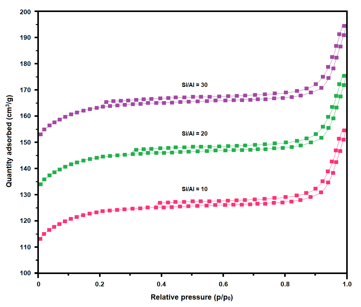Figure 2 displays the nitrogen (N2) adsorption–desorption isotherms at 77 K for MOR samples synthesized with SARs (10, 20, and 30). All samples exhibit type I adsorption isotherms, characteristic of predominantly microporous materials according to the IUPAC classification. The steep nitrogen uptake at low relative pressures (p/p0 < 0.1) confirms the dominance of microporosity in all MOR samples. A subtle hysteresis loop is observed at high relative pressures (0.8 < p/p0 < 1.0), which can be attributed to the presence of secondary mesoporosity or intercrystalline voids formed by the aggregation of zeolite crystals.