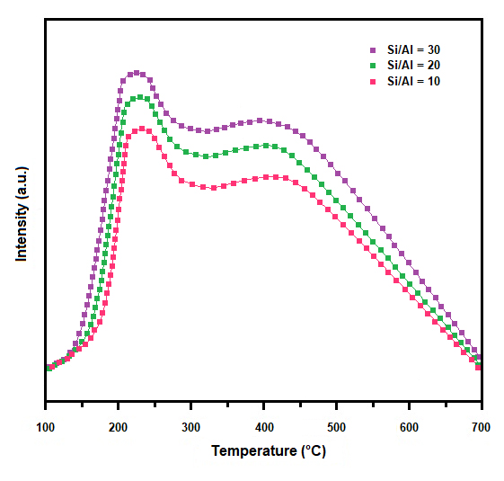 Figure 3 presents the NH3-TPD profiles of the MOR samples with SAR values of 10, 20, and 30. NH3-TPD is a widely used technique for evaluating both the strength and the density of acid sites in microporous solids, particularly zeolitic materials.