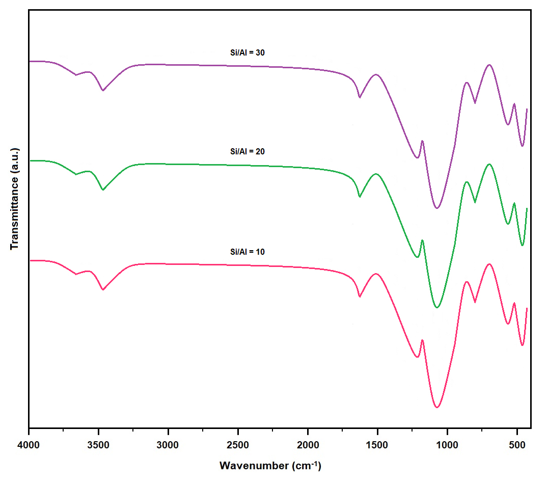 Figure 4. FTIR spectra of MOR synthesized at different SARs (10, 20, 30). The spectra display typical mordenite framework vibrations, including asymmetric stretching (1000–1200 cm−1), symmetric stretching (~800 cm−1), and T–O bending modes (~450–550 cm−1), which shift slightly with increasing Si content.