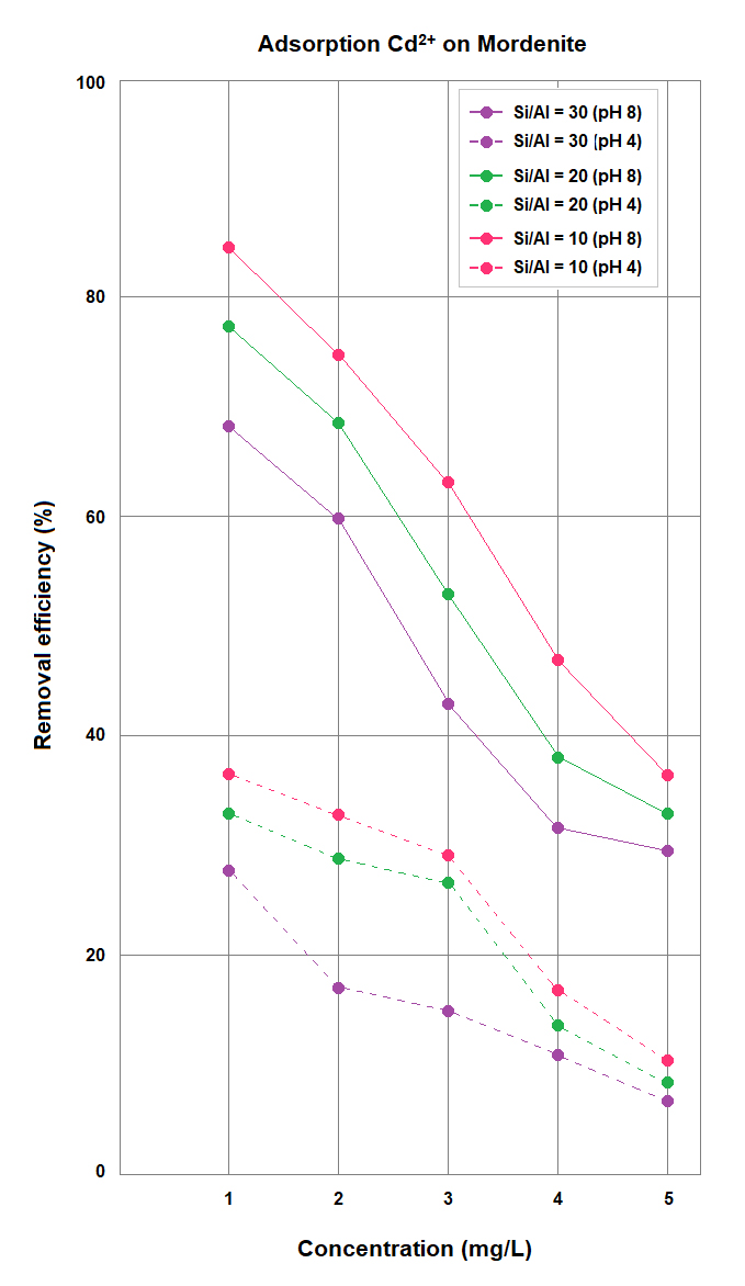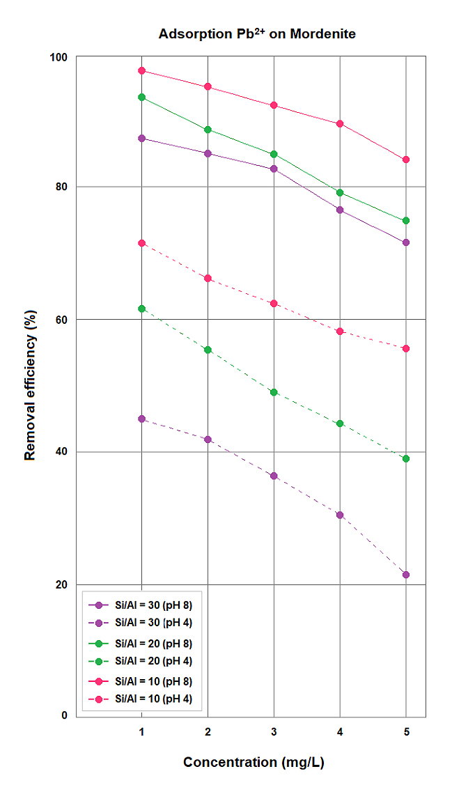 Adsorption tests indicated that MOR is effective in removing Pb2+, Cu2+, and Cd2+ ions from aqueous solutions, particularly under alkaline conditions (pH 8). The removal efficiencies followed the trend Pb2+ > Cu2+ > Cd2+, reflecting the intrinsically higher affinity of Pb2+ for negatively charged surfaces. At lower initial concentrations (1–2 mg L−1), Pb2+ removal exceeded 90%, even for the high-silica 30-MOR sample, whereas Cu2+ and Cd2+ showed removal behavior more dependent on zeolite composition and solution pH. The MOR sample with SAR = 10 exhibited the best performance under acidic conditions (pH 4), owing to its higher density of framework negative charges associated with elevated aluminum content.