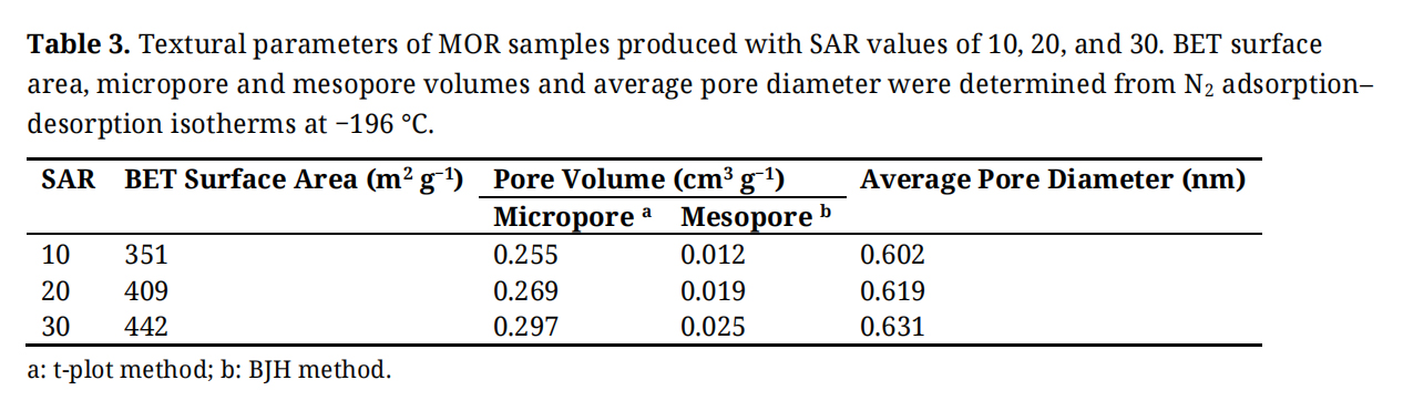 The influence of SAR on pore development is commonly associated with the structural characteristics of high-silica zeolites, which tend to form more stable and well-ordered frameworks with fewer structural defects. Such frameworks favor the generation of accessible microporosity and reduce the likelihood of framework collapse during crystallization and subsequent thermal treatments. Therefore, the N2 adsorption–desorption results highlight the critical role of SAR in governing the textural properties of mordenite, which in turn influences its potential behavior in adsorption-based applications.