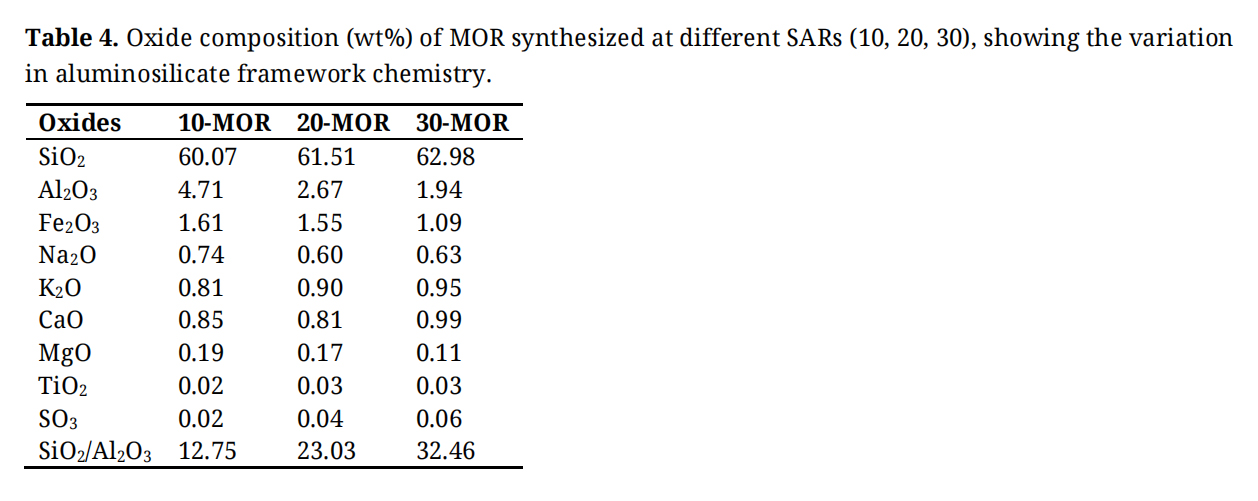 Table 4 presents the chemical composition of the MOR zeolites synthesized with different SARs (10-MOR, 20-MOR, and 30-MOR). As expected, a progressive increase in silica (SiO2) content is observed, rising from 60.07% in 10-MOR to 62.98% in 30-MOR. This trend is accompanied by a pronounced decrease in alumina (Al2O3) content, from 4.71% to 1.94%, demonstrating the effective modulation of sample composition throughout the hydrothermal synthesis process.