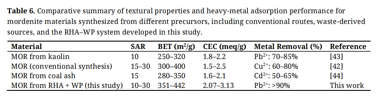 These findings demonstrate that waste-derived mordenite is not only technically effective but also environmentally and economically advantageous. The use of RHA and WP as feedstocks enables a low-cost and low-emission synthesis route compatible with circular-economy principles. The tunable performance achieved through Si/Al adjustment highlights the material’s potential application in adsorption-based water-treatment processes. Overall, this work provides a robust and sustainable basis for the development of waste-derived zeolitic materials for heavy-metal removal from aqueous systems.