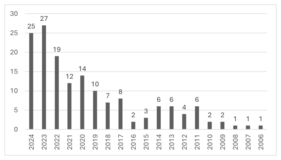 From 2017 to 2024, there is a significant increase in publications, with 2023 being the year with the highest number of articles published, totalling 27 (n= 27). However, analysing the graph’s projection, 2024 is slightly lower than 2023, with in only two fewer articles. It could be inferred that the highest year of publication is 2024, although the maximum number of published papers has not yet been reached.
