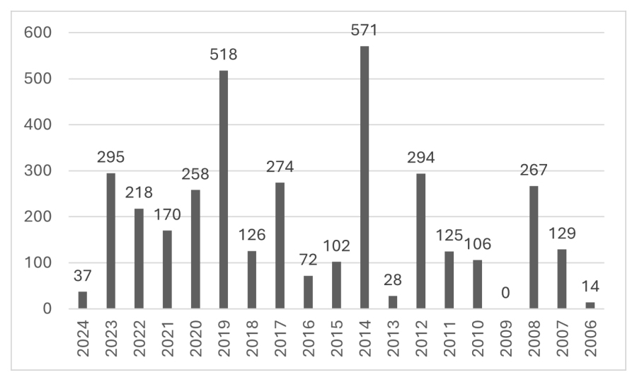 With regard to impact, Figure 3 shows the annual citation trend, measured as the total number of citations received per year by the articles in the sample. The peak is observed in 2014 (n = 571), followed by 2019 (n = 518). 2023 ranks third (n = 295). Although 2024 shows an upward pattern in terms of publication volume, its citation count cannot yet be interpreted as comparable because citations accumulate over time. This dynamic is consistent with citation-lag effects and the consolidation of influential contributions published in earlier years, while the more recent growth indicates a sustained and increasing scholarly interest in the nexus between sustainability, organisational management, human resource management and organisational leadership.