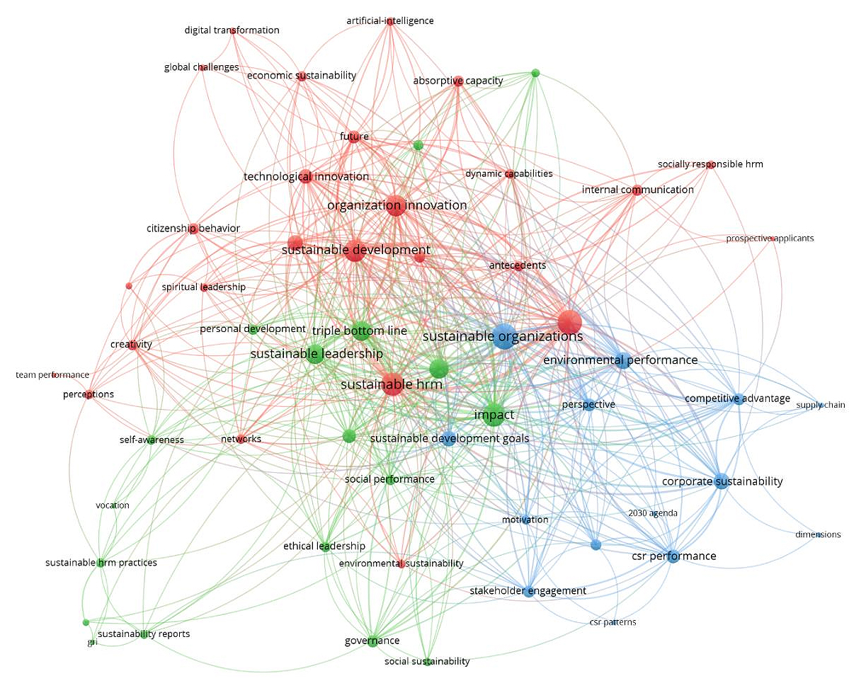 Analysis of the network suggests the densest lines of connection reveal an emerging integration of SHRM and SL through the nodes representing sustainable organizations, impact and sustainable performance. However, link density is not yet homogeneous, indicating persistent conceptual fragmentation: SHRM maintains its emphasis on functional coherence, while SL retains its orientation towards cultural cohesion.