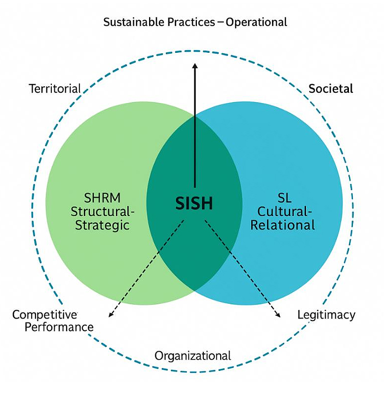 Figure 6. Graphical Representation of the SISH. Source: Authors’ own preparation based on the principles of the SISH model. Note: Reading Figure 6 as a proposition-generating device, it operationalises the design principles by visually linking the structural-strategic (SHRM) and cultural-relational (SL) planes through a bidirectional mechanism of convergence. The projection of SPs as the operative expression of this convergence clarifies why sustainable outcomes are expected to be configurational rather than linear, and why moderation (SHRM) and mediation (SL) become theoretically necessary mechanisms within the model.