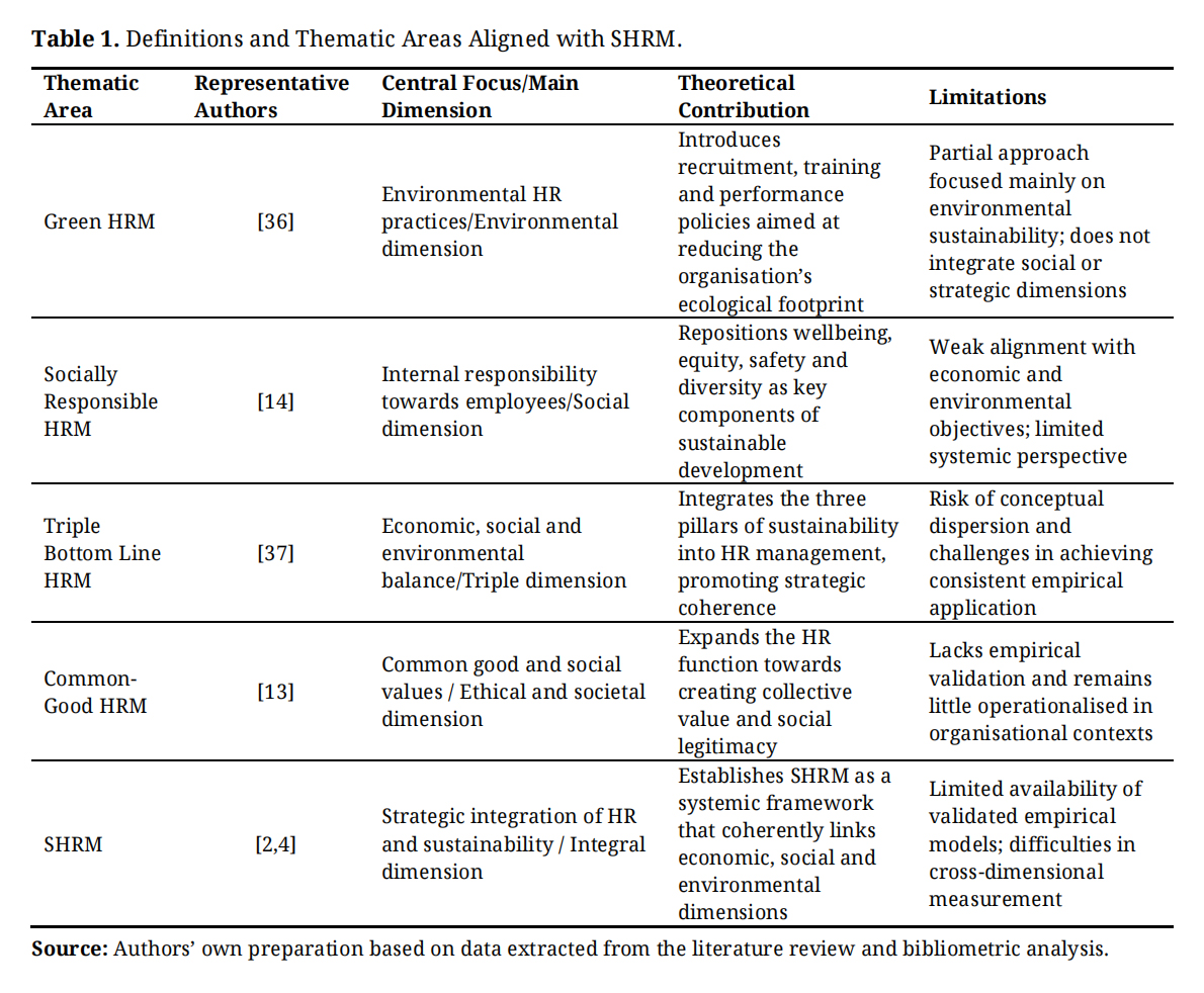 In this line, and following the contributions of [2,4] SHRM can be conceptualised as a system of organisational convergence that aligns policies, strategies and values under the logic of sustainability. From this perspective, SHRM functions as a bridge between strategic aspirations and everyday work experience, connecting corporate priorities with human wellbeing and environmental regeneration. Table 2 compares key conceptual and empirical contributions that underpin this transition.