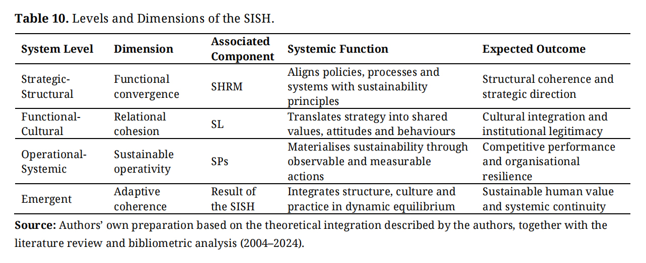 Together, SHRM and SL converge to form an integrated system of human sustainability. Their interaction ensures both operational coherence and cultural legitimacy, guaranteeing that sustainability does not remain confined to strategic documents but becomes embedded in daily practices and long-term orientation. This synthesis positions the SISH as a conceptual platform for future empirical exploration.