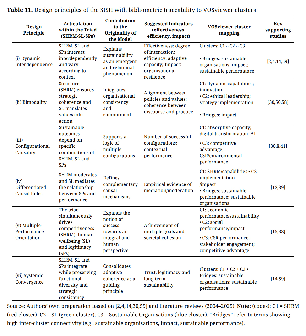 In order to strengthen transparency between the bibliometric evidence and the conceptual synthesis, each design principle is derived explicitly from the tripartite architecture observed in the co-occurrence network (Figure 5; Table 9). On this basis, the principles in Table 11 are formulated as explanatory mechanisms that clarify how structure-culture-outcomes are connected and why sustainability is expressed in a configurational rather than a linear manner. In this respect, Table 11 does not merely summarise conceptual attributes, rather it specifies the causal logic of the SISH: principles (i)–(iii) establish the model’s relational and configurational ontology, while principles (iv)–(vi) delineate the roles through which SHRM and SL condition the effectiveness of SPs and the system’s capacity to sustain performance, legitimacy and human wellbeing simultaneously, coherently and across multiple scales-spanning the organisational, territorial and societal levels.