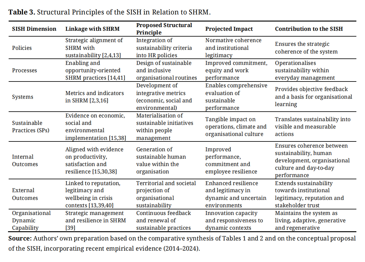 Based on the preceding evidence, Table 3 contextualises the role of SHRM within the SISH through seven structural principles: policies, processes, systems, SPs, internal outcomes, external outcomes and organisational dynamic capability. Each dimension links the SHRM literature with a corresponding structural principle, its projected impact and its specific contribution to the SISH, highlighting the role of SHRM as a vector of coherence and strategic structuring.