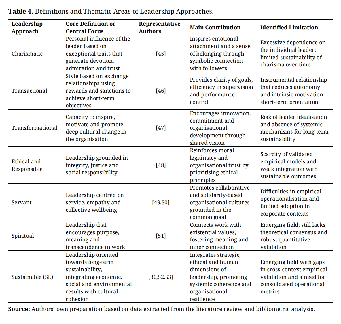 Spiritual leadership subsequently foregrounded purpose, meaning and transcendence at work, with evidence linking it to psychological wellbeing, organisational commitment and prosocial behaviour, thereby offering additional conceptual resources for sustainability-oriented leadership [51]. Together, these developments form the antecedents that shaped the transition towards SL. Table 4 synthesises representative leadership approaches, their theoretical contributions and their limitations.