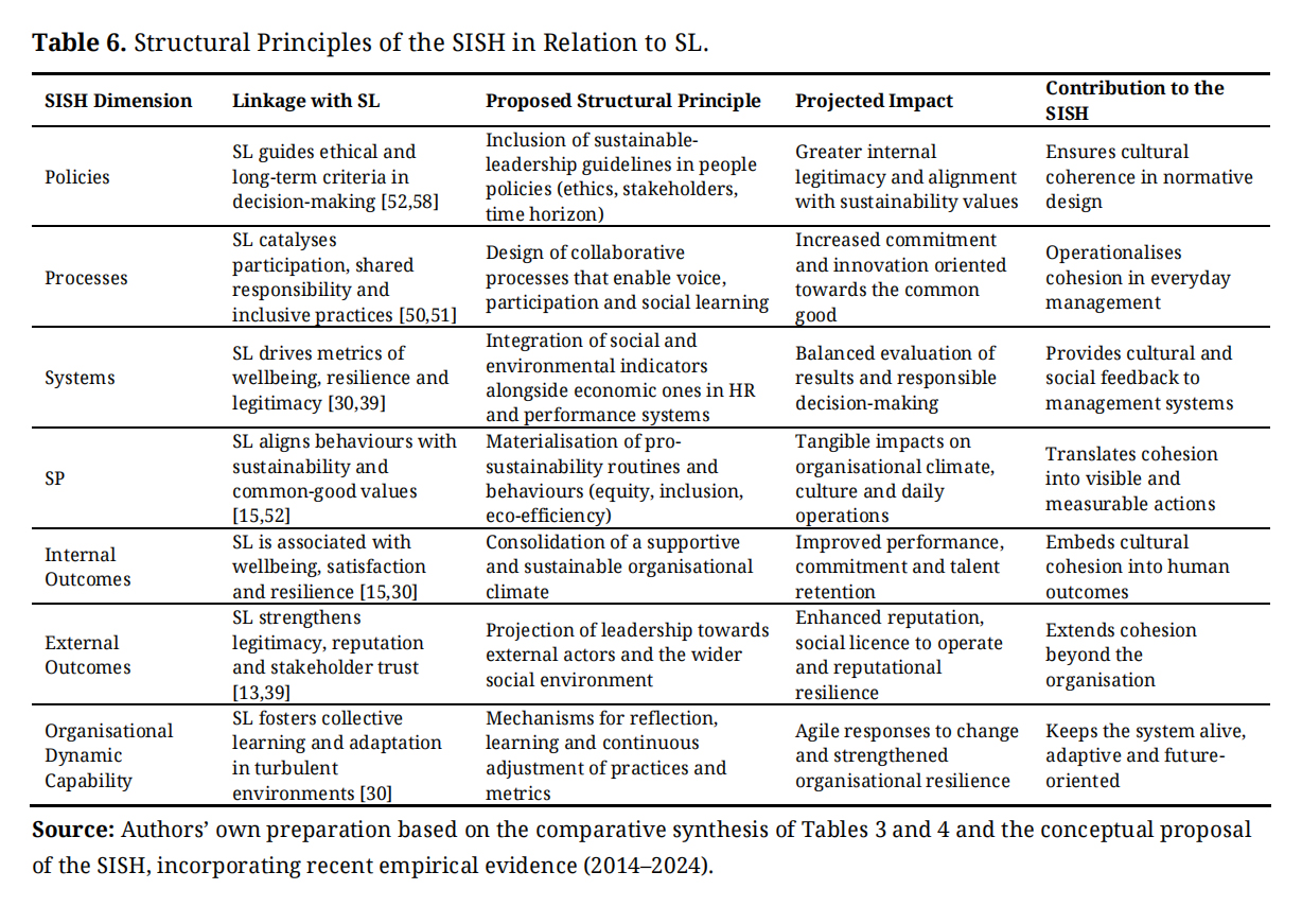 Drawing on the preceding evidence, Table 6 contextualises the role of SL within the SISH through seven structural principles parallel to those applied to SHRM: policies, processes, systems, SPs, internal outcomes, external outcomes and organisational dynamic capability. Each dimension links SL literature with an operative principle, its projected impact and its specific contribution to the SISH, emphasising the role of SL as a driver of cultural and functional cohesion.
