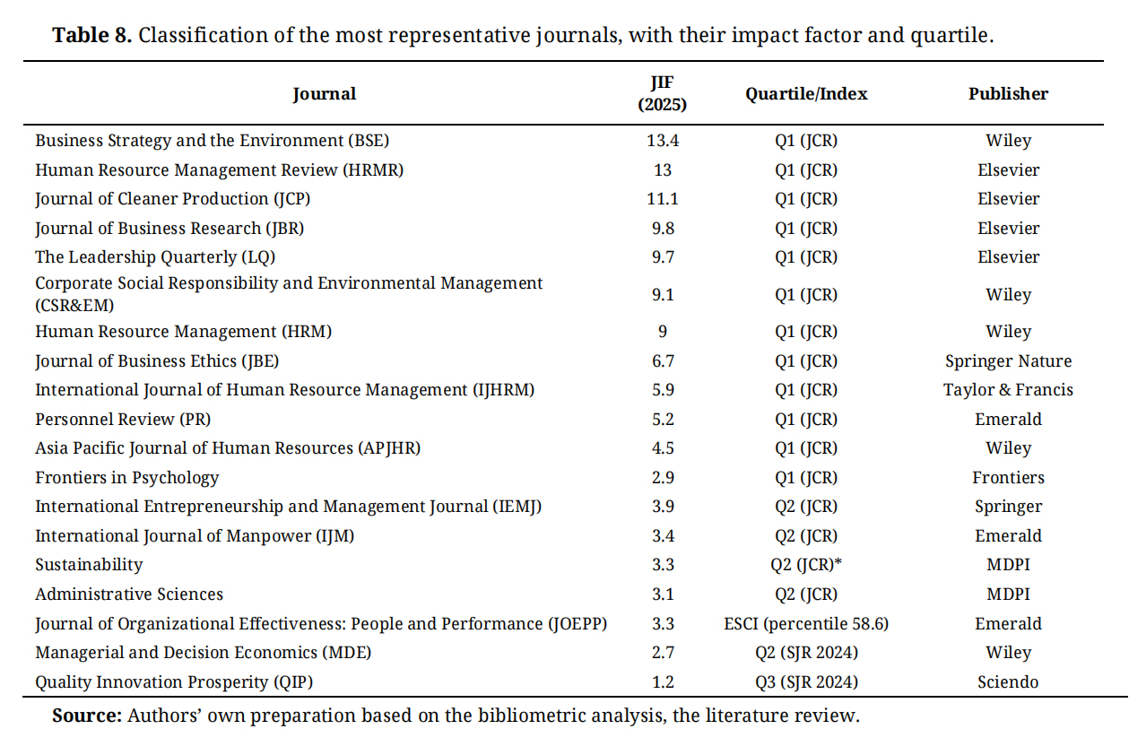 From the perspective of journals, Table 8 summarises the leading outlets that have published the analysed articles, their Journal Impact Factor (JIF 2025), quartile and indexing. The analysis shows a clear concentration of publications in high-impact journals (Q1), which reflects the theoretical and methodological maturity of the field. Particularly prominent are Business Strategy and the Environment (JIF = 13.4, Wiley), Human Resource Management Review (JIF = 13.0, Elsevier) and Journal of Cleaner Production (JIF = 11.1, Elsevier), all of which feature cutting-edge studies on corporate sustainability, people management and ethical leadership [22,68].