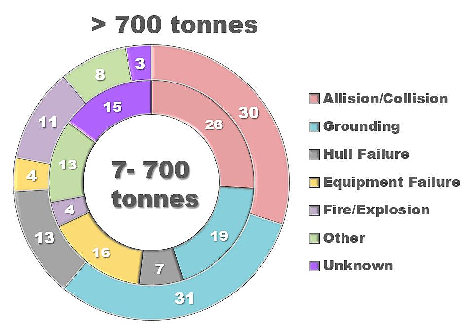 Figure 1. Causes of tankers spills [5]. The inner circle represents the number of smaller oil spills, ranging from 7 to 700 tons, while the outer circle depicts the number of larger spills that are more than 700 tons.