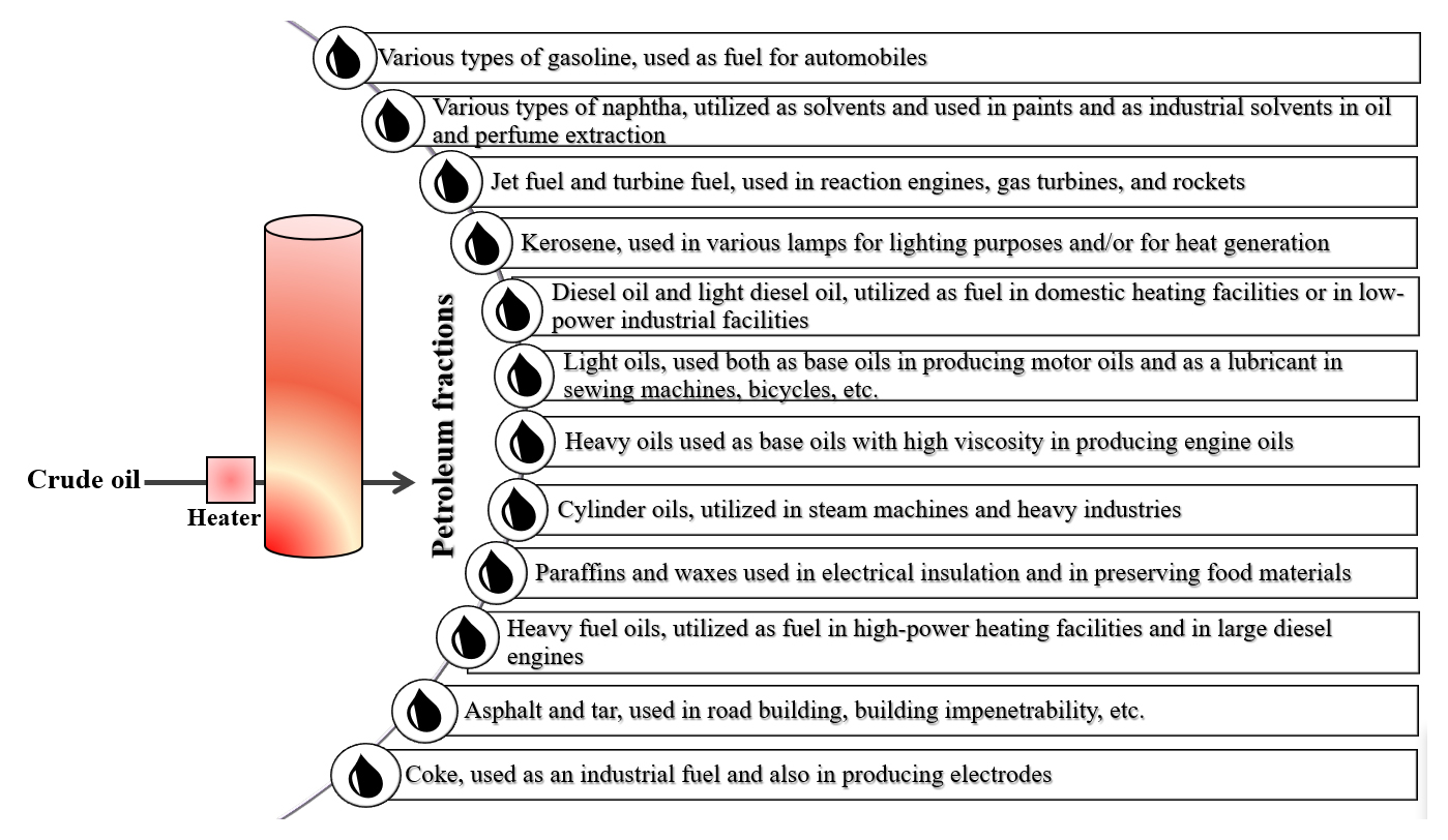Crude oil is a complex mixture of organic substances that can be separated by fractional distillation. Therare more than 2000 known types of petroleum products that are obtained from crude oil. The main petroleum products of interest for this review are listed in order of increasing molecular weight from the bottom to the top in Figure 6 [48].