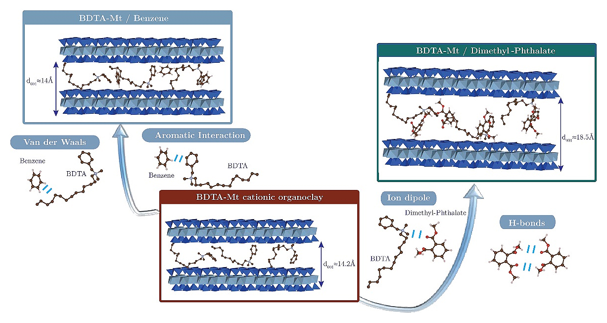Figure 7. Possible adsorption mechanisms in a BDTA-Mt cationic organoclay showing a lateral surfactant arrangement involved in the sequestration of benzene, a nonpolar hydrophobic organic compound [26].