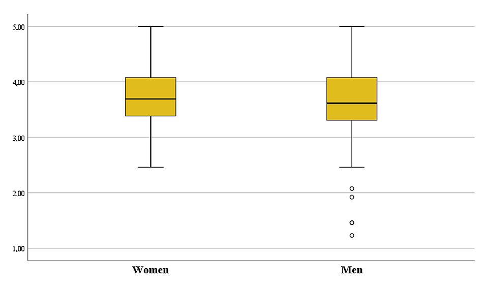 The Mann-Whitney U test was performed (as shown in Table 3) to examine the existence of gender variations in consumer perceptions of sustainability in e-commerce. The results demonstrated no statistically significant differences between male and female respondents. Thus, we find no definitive evidence to suggest a disparity in the sustainability perception between genders. Figure 1 provides a visual representation of these findings.