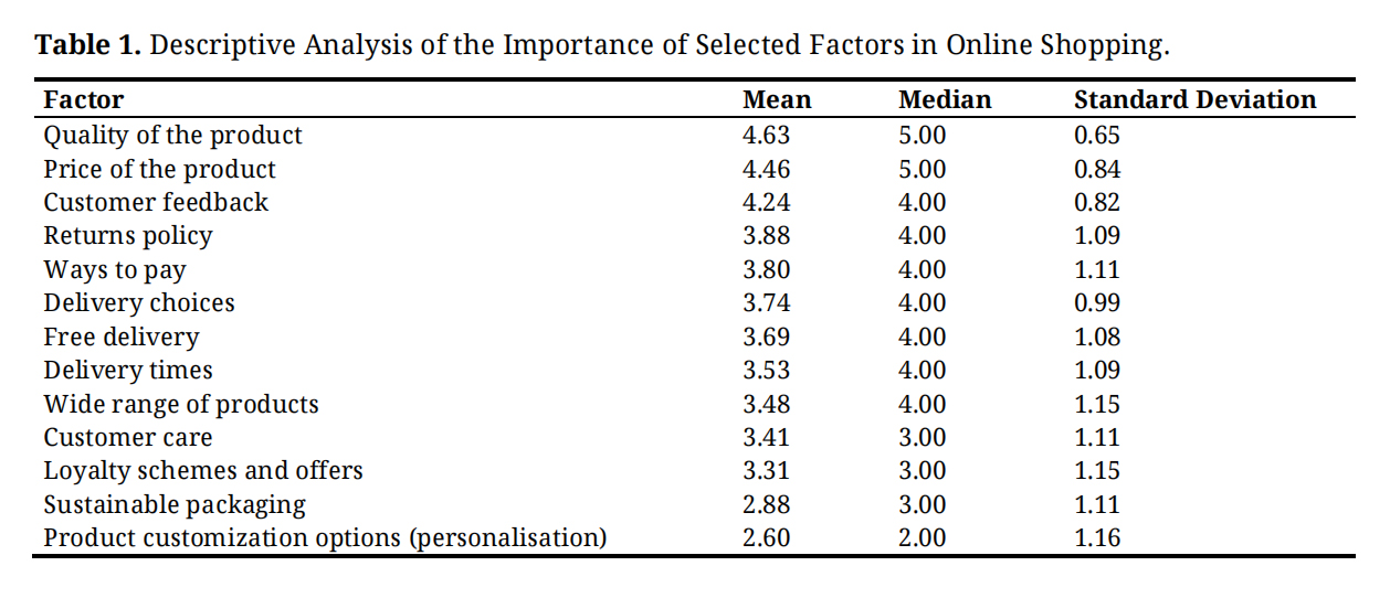 Table 1. Descriptive Analysis of the Importance of Selected Factors in Online Shopping.