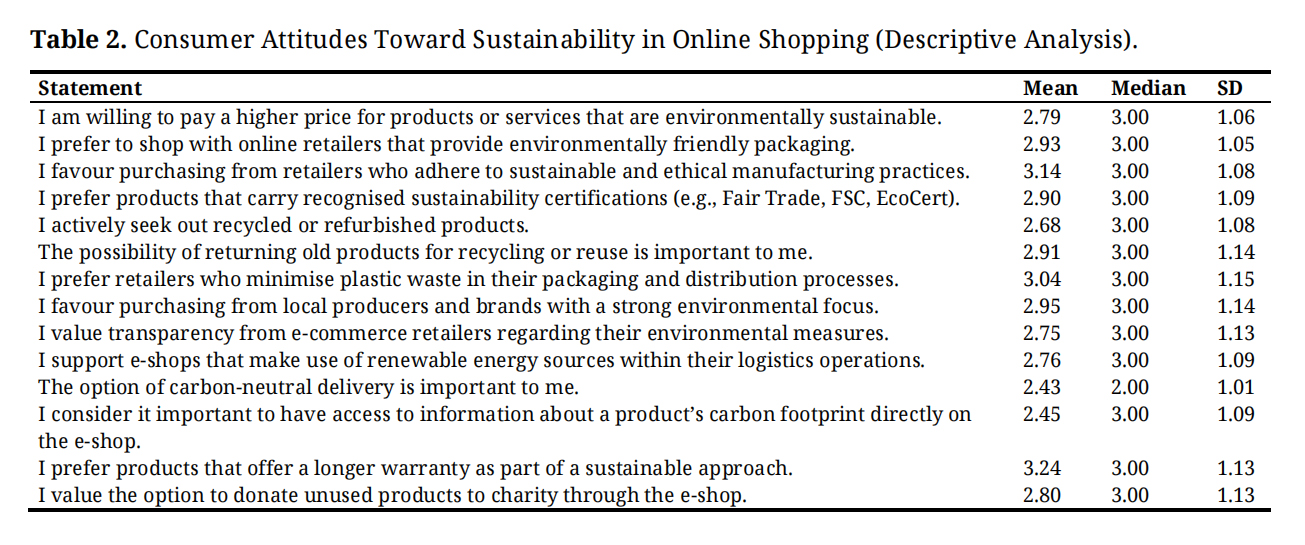 Table 2. Consumer Attitudes Toward Sustainability in Online Shopping (Descriptive Analysis).