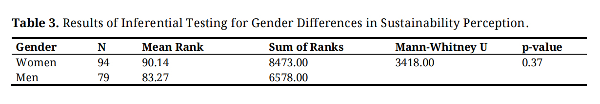 Table 3. Results of Inferential Testing for Gender Differences in Sustainability Perception.
