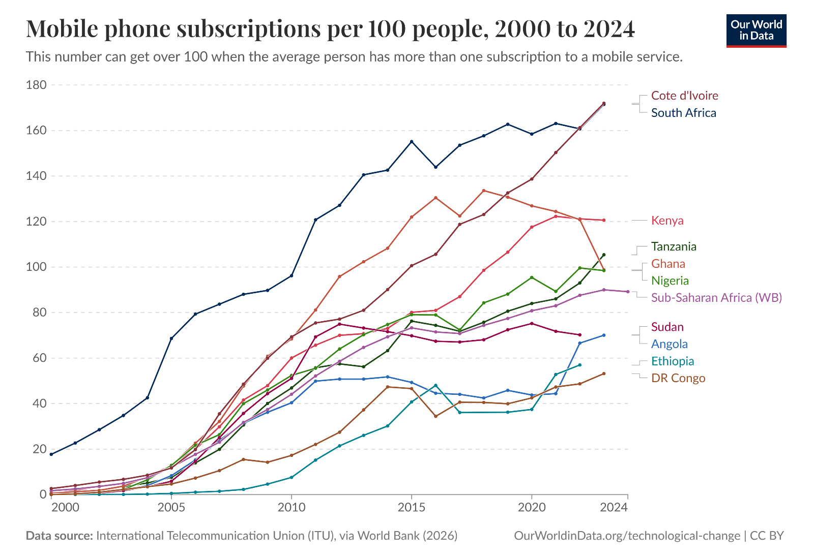 Figure 3. Mobile phone subscriptions per 100 people, 2000 to 2023 [49].