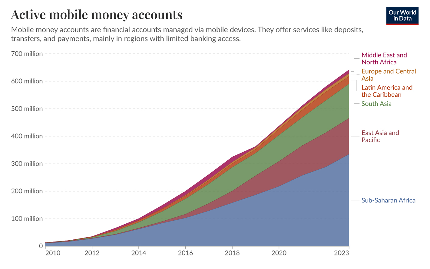 Figure 5. Active mobile money accounts globally 2010 to 2023 [51].