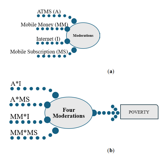 Figure 6. (a) Conceptual Model depicting the proxies of financial inclusion (top two) and the digital inclusion (bottom two). (b) Conceptual Model depicting four moderation combinations of financial and digital inclusion on poverty.