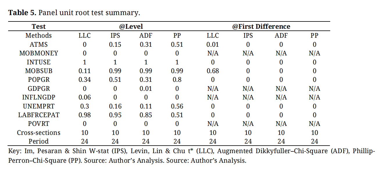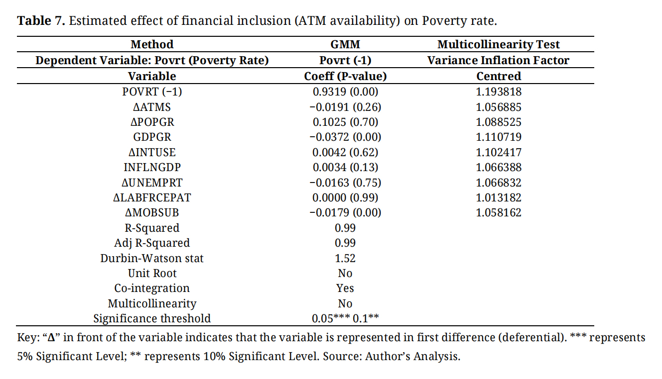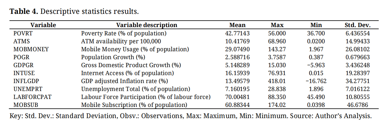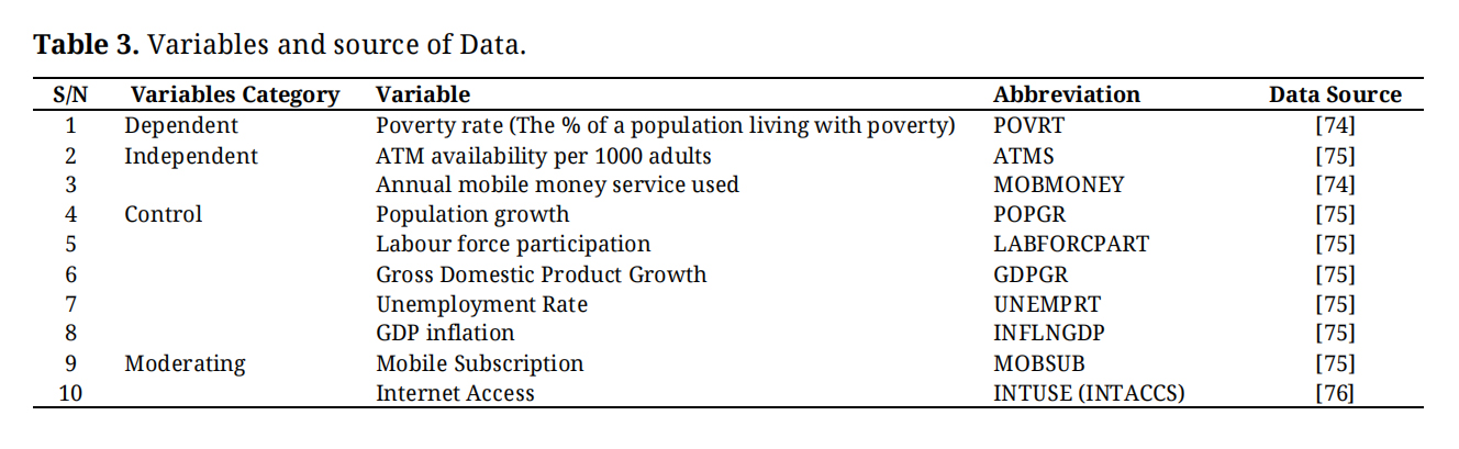 Secondary data on poverty rate, financial inclusion availability (ATM and mobile money subscription), unemployment rate, GDP growth, labour force participation, GDP inflation, population growth, and internet access in these countries were collected from credible sources (the database of World Bank, the global economy, and Our World in Data). The study’s representations of financial inclusion are all direct financial inclusion proxies in ATMs and mobile money services. Automated teller machines (ATMs) are mostly used by banking institutions, while mobile money service is essentially a financial technology used by both traditional, neo banks, and FinTech firms. Unemployment, labour force participation, and gross domestic product growth were captured as control variables because they reflect and sometimes influence (in case of unemployment) the poverty rate within an economy.