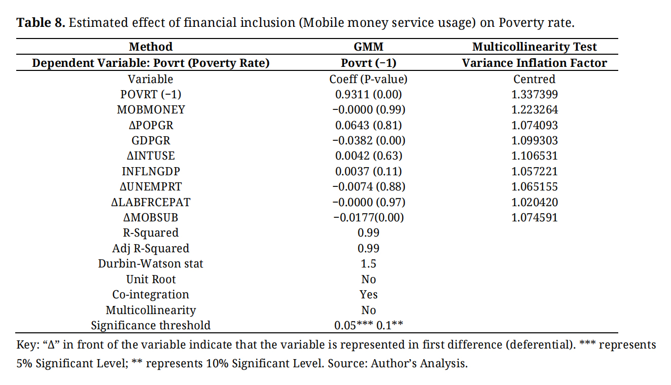Some other financial inclusion and poverty alleviation studies examining African nations but focusing on the sub-Saharan region mainly provided similar results. For, [31] examined poverty reduction and financial inclusion in thirty-five sub-Saharan African nations and focused on whether financial inclusion could improve welfare benefits using the propensity score matching technique and the treatment effect model. Their results show that the financially included poor have better wealth and welfare benefits. This testifies to the positive impact of financial inclusion on poverty reduction and on the poverty rate.