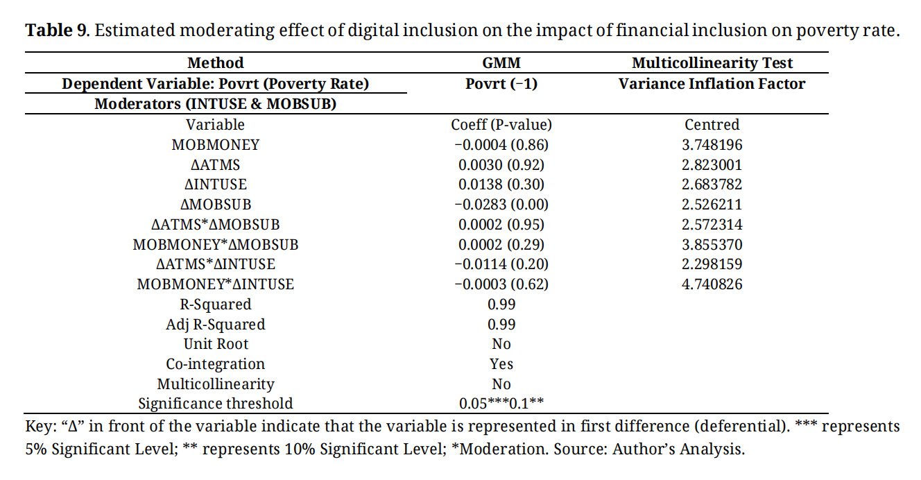 This model captures four moderation combinations of the proxies for financial inclusion and digital inclusion. These combinations represent realistic possibilities of how these two inclusion variables can be combined. For instance, the combination Mobile Money (MM) and Internet (I) explain the combined use of mobile money and the internet for financial or digital purposes. The combination of these two would provide avenues for mobile money transactions (e-wallet), use of bank applications, websites, and other internet-related transactions as well as economic empowering digital activities within the scope of the internet. Another example is the MM*MS combination which captures facilities like the USSD, transaction text alerts services, customer care hotline use, and other mobile-related digital and banking activities common only to mobile phones.